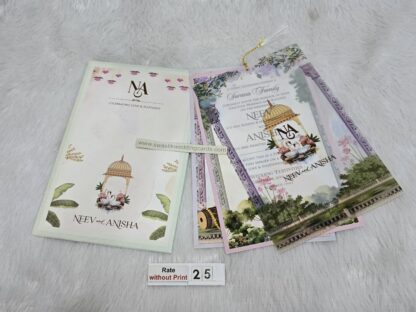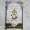 This card has a very elegant floral design which looks very attractive. This card has a tracing paper also known as butter paper and vellum paper with floral print on it . This card has 2 floral insert tied with a tussle. It has a box style cover .