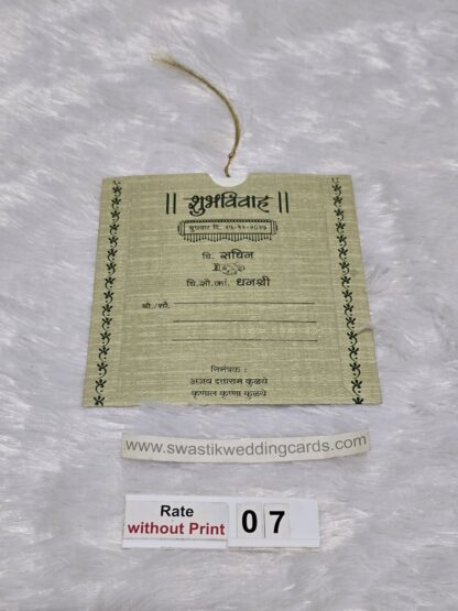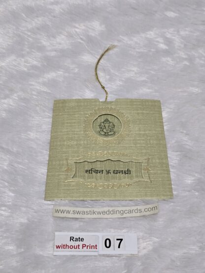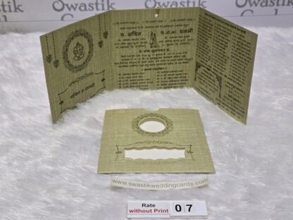 The card is made of imported paper it has a round type cutting in center with a horizontal rectangular cutting below. The inside paper is long in length and it is divided into 4 equal portion. The inside paper is tied with silk thread which has to be pulled out of the jacket. The art work of design will be provided from us on your mail id. The Ganesha image on the cards can be replaced by any other religious image or logo.The inside paper will be plain all design ,logo and text have to be printed afterwards during your printing process. This wedding invitation card looks small in size but it’s easy to carry many cards at a time for distribution.