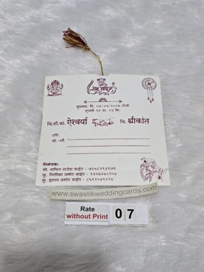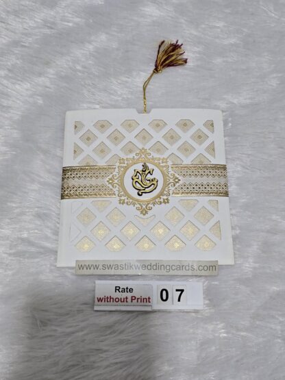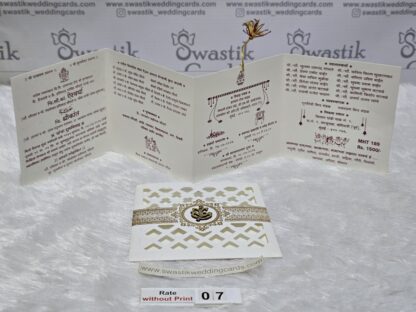 The card is made of imported paper it has a round type cutting in center with a horizontal rectangular cutting below. The inside paper is long in length and it is divided into 4 equal portion. The inside paper is tied with silk thread which has to be pulled out of the jacket. The art work of design will be provided from us on your mail id. The Ganesha image on the cards can be replaced by any other religious image or logo.The inside paper will be plain all design ,logo and text have to be printed afterwards during your printing process. This wedding invitation card looks small in size but it’s easy to carry many cards at a time for distribution.