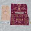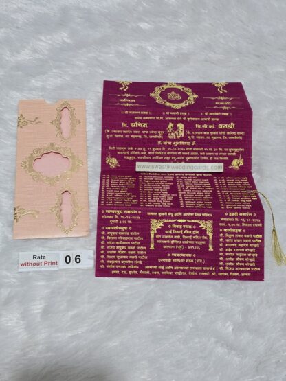 The card is made of imported paper it has a round type cutting in center with a horizontal rectangular cutting below. The inside paper is long in length and it is divided into 4 equal portion. The inside paper is tied with silk thread which has to be pulled out of the jacket. The art work of design will be provided from us on your mail id. The Ganesha image on the cards can be replaced by any other religious image or logo.The inside paper will be plain all design ,logo and text have to be printed afterwards during your printing process. This wedding invitation card looks small in size but it’s easy to carry many cards at a time for distribution.