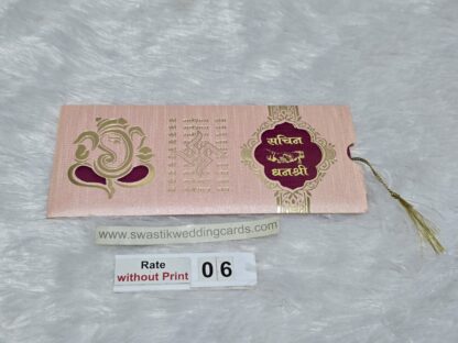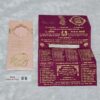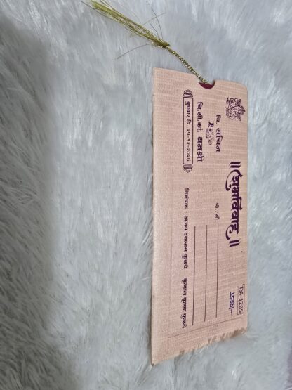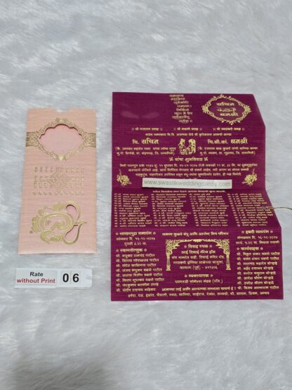The card is made of imported paper it has a round type cutting in center with a horizontal rectangular cutting below. The inside paper is long in length and it is divided into 4 equal portion. The inside paper is tied with silk thread which has to be pulled out of the jacket. The art work of design will be provided from us on your mail id. The Ganesha image on the cards can be replaced by any other religious image or logo.The inside paper will be plain all design ,logo and text have to be printed afterwards during your printing process. This wedding invitation card looks small in size but it’s easy to carry many cards at a time for distribution.