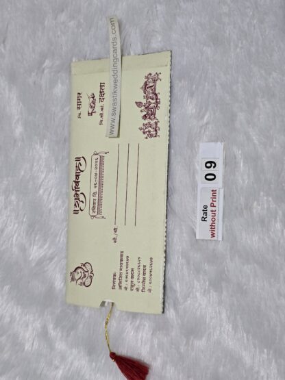The card is made of imported paper it has a round type cutting in center with a horizontal rectangular cutting below. The inside paper is long in length and it is divided into 4 equal portion. The inside paper is tied with silk thread which has to be pulled out of the jacket. The art work of design will be provided from us on your mail id. The Ganesha image on the cards can be replaced by any other religious image or logo.The inside paper will be plain all design ,logo and text have to be printed afterwards during your printing process. This wedding invitation card looks small in size but it’s easy to carry many cards at a time for distribution.
