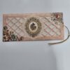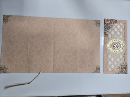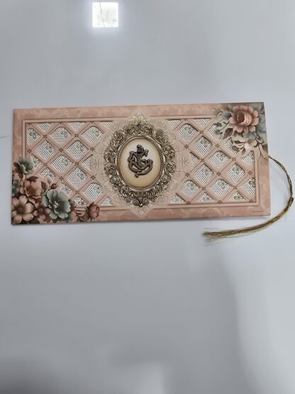 The card is made of imported self textured paper it has a round type cutting in center with a horizontal rectangular cutting below. The inside paper is long in length and it is divided into 4 equal portion. The inside paper is tied with silk thread which has to be pulled out of the jacket. In this the jacket wont’t be pasted it will be open after printing the design and cover text together it has to be pasted. The pasting work will be done by the person from where you get the card printed. The art work of design will be provided from us on your mail id. The Ganesha image on the cards can be replaced by any other religious image or logo.The inside paper will be plain all design ,logo and text have to be printed afterwards during your printing process. This wedding invitation card looks small in size but it’s easy to carry many cards at a time for distribution.