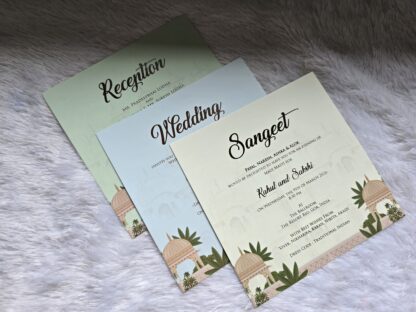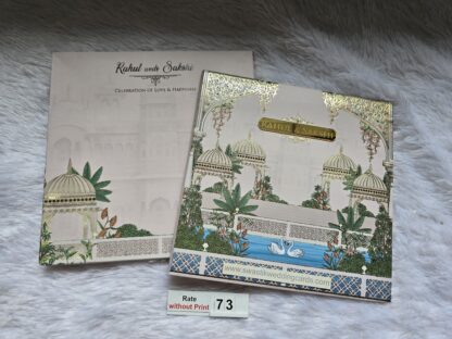 premium hardbound wedding invitation card with peacock print and 3D popup effect with Box cover and 2 inserts.