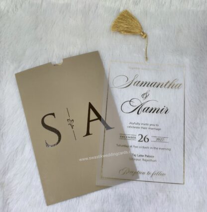 Butter(Transparent) paper wedding invitation card with plastic seal and digital inserts and a mettalic card box cover.