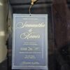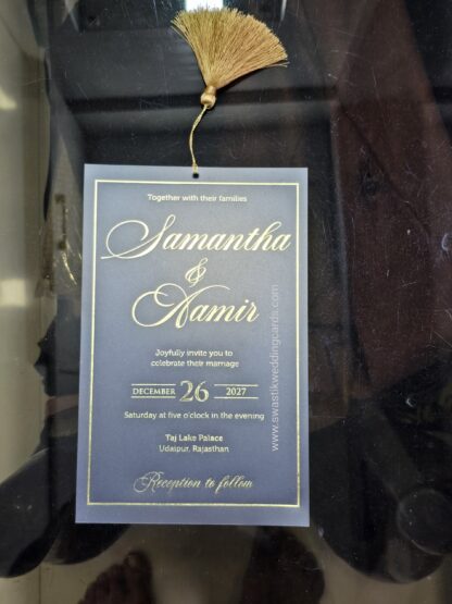This wedding invite is made up of an Imported quality matt finish mettalic paper. It is an jacket style invitation card with no cover.Inside the jacket it has a single sheet of frosted film tied with a royal golden tussel.The tussel needs to be pulled to remove the frosted film out of the jacket.