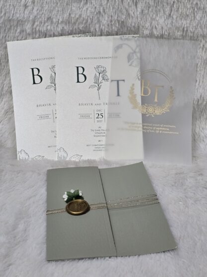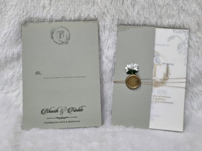 This wedding invitation is made up of premium quality matt finish textured Paper. It is a folder style wedding invitation card, and it has 2 inserts and a butter (tracing) paper inside. The card has an Plastic seal along with artificial flowers and a golden thread.It has a box style cover.