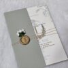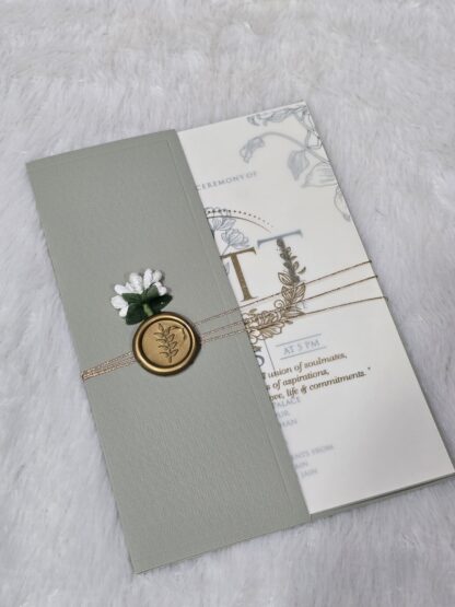 Premium quality matt finished card with plastic seal,artificial flower and golden thread along with 2 insert and box cover.
